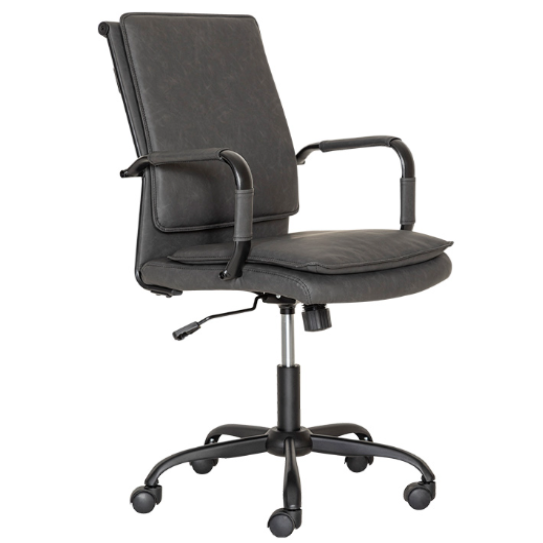Marco en respaldo, tubular de acero planchado de 1” cal. 18, doblado en forma ergonómica, travesaños para fijar herraje en tubo planchado de 1” cal. 18 pintado, manerala en la parte posterior para mover el sillón en tubular 1” cal. 18, en color negro, respaldo en tapiz tensada con acojinamiento de vinil en color chocolate, gris o café, asiento tapizado en vinil color chocolate, gris o café y con triplay en el interior de 1.2 mm de grosor, hule espuma con densidad 50g/m3, brazos en tubular de acero elíptico de 1¼” cal. 18, negros, con funda en vinil color chocolate, gris o café, pistón ejecutivo en negro, base metálica en color negro matte de 26”, mecanismo ejecutivo, sistema reclinable, mecanismo de bloqueo y ajuste neumático de altura.